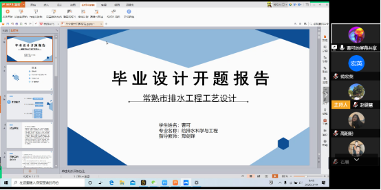 防控疫情延迟返校期间,响应学校“停课不停教、停课不停学”要求,为了进一步规范毕业设计(论文)的过程管理,保质保量完成本科生毕业设计(论文)工作,依据学校毕业设计(论文)的相关要求,学院制定了关于开展2020届毕业设计(论文)开题汇报工作的实施方案,从3月9日开始,学院师生聚“云”端进行毕业设计(论文)开题汇报。汇报分为9个小组进行,分别为污水1组、污水2组、给水1组、给水2组、建水组、工业水1组、工业水2组、大气组和论文组,每组由经验丰富的指导老师任组长,5-7位指导老师任委员。各小组分别采用腾讯会议、QQ群等方式进行。现已多个小组完成开题汇报,其他小组紧锣密鼓、陆续开展,计划在3月底之前全部完成。